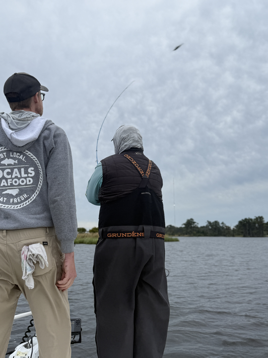 Reeling in redfish with finesse on a partly cloudy day in New Bern!