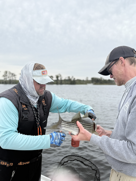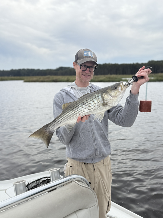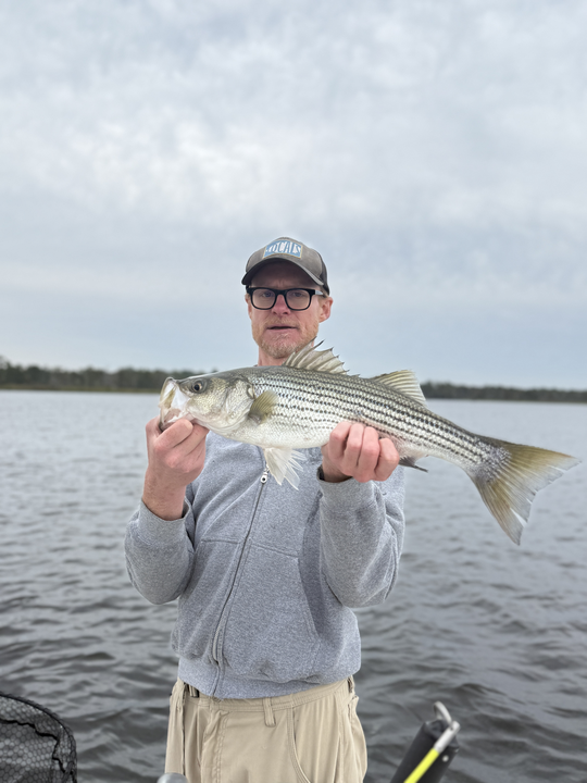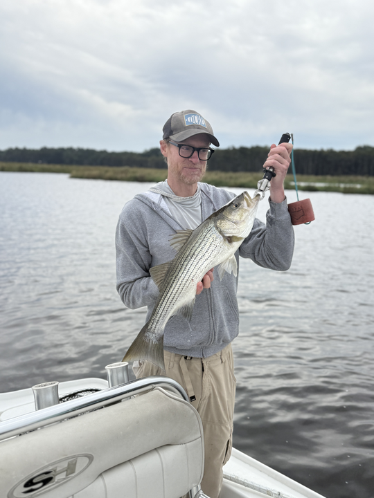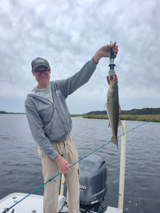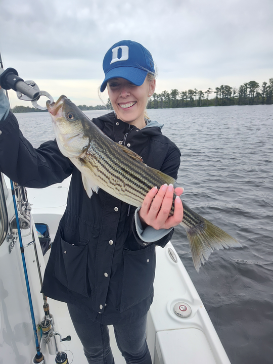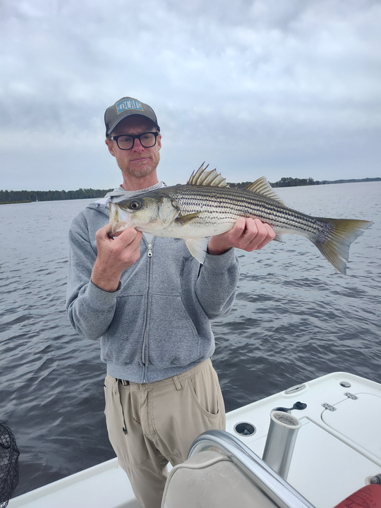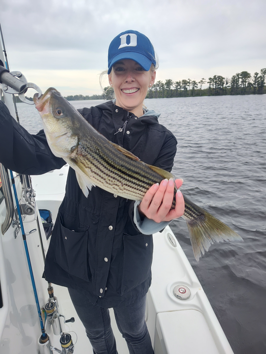 Nice striped bass on light tackle in New Bern! Clear conditions made for an exciting day on the water.